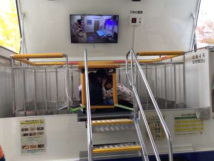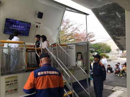 3年生は防サイ君に乗り、震度7の揺れを体験しました。揺れの恐ろしさと予想以上に音が大きいことに驚いていました。