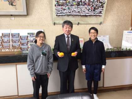 5時間目が終わった後に、栽培委員会の委員長と副委員長が校長室を訪ね、みかんをプレゼントしました。