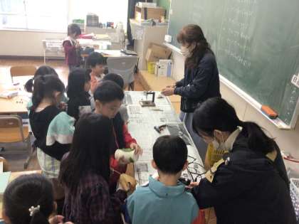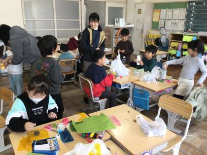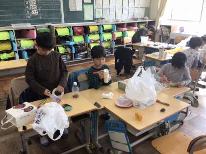 生活科では、公園で集めたドングリやマツボックリを使って、おもちゃ作りをしていました。