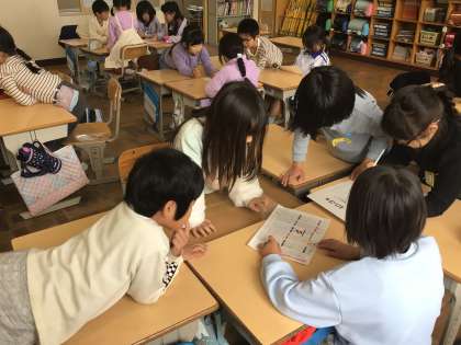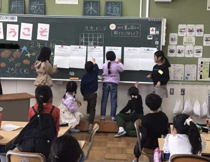 算数科「九九ビンゴ」では、グループになってビンゴのマス目に九九を書き込み、ビンゴカードを完成させました。