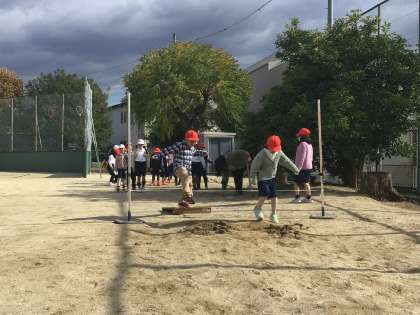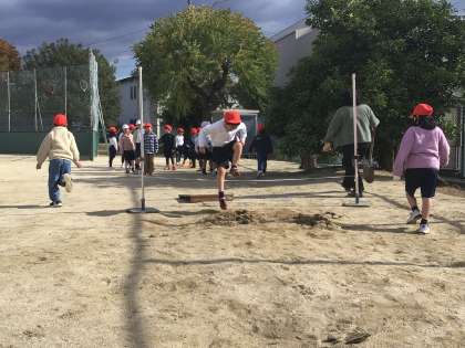 体育科「とびあそび」では、コースに分かれてゴム跳びをしていました。
