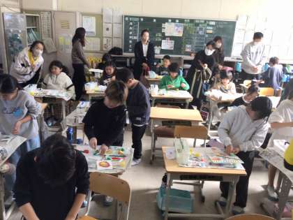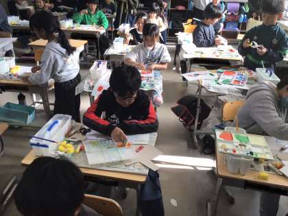 3年生は、自分でみかんの型紙を作ってスタンピングでオリジナルみかんを作りました。