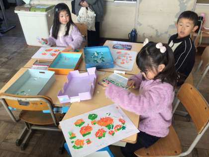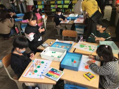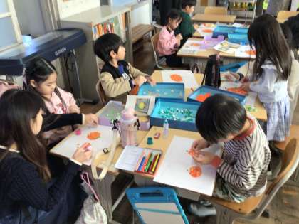 1年生は、ちぎり絵です。折り紙をちぎってお気に入りのみかんを作りました。