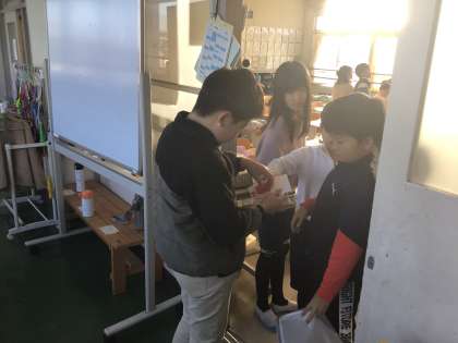 登校後募金活動グッズを持って担当クラスへ行き、募金に協力してくれた子に赤い羽根を渡します。