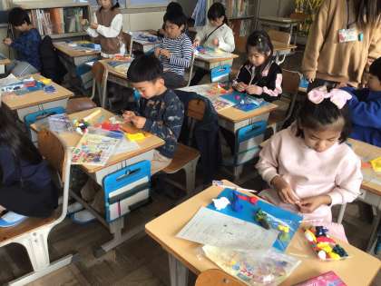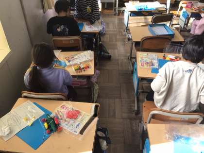 図画工作科では、カラー紙粘土を使ってお弁当作りをしていました。ミートボールを作ったりにぎり寿司を作ったりして楽しく活動していました。