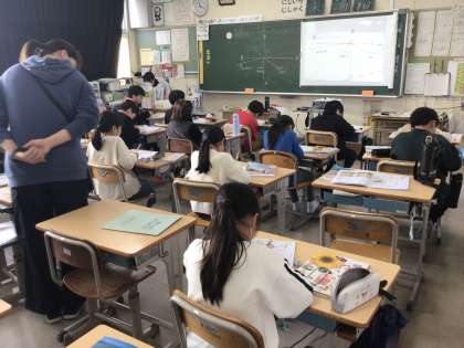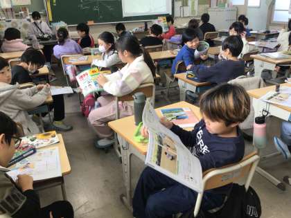 理科「地面のようすと太陽」では、学習の振り返りをしていました。理科ノートにまとめた後、ペアで自分の考えを伝え合っていました。