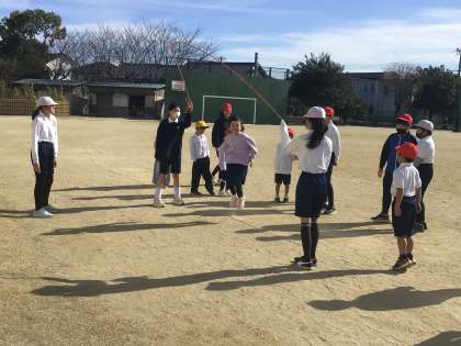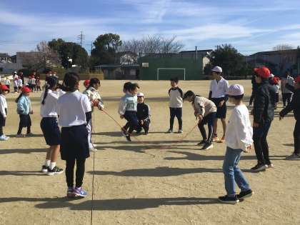 3時間目に運動場で1年生と6年生が一緒になわとび練習をしていました。