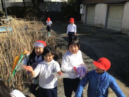長い休み時間に運動場に行くと、わくわく池に子どもたちが集まっていました。