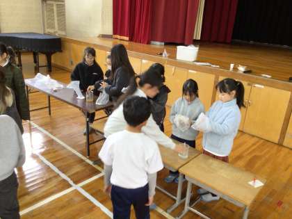 石けん作りでは、5年生が丁寧に教える姿が見られました。