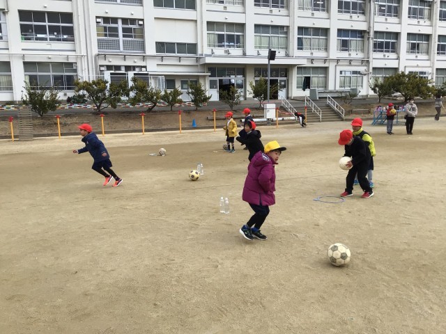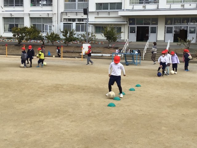 体育科では、運動場でボール蹴り遊びをしていました。