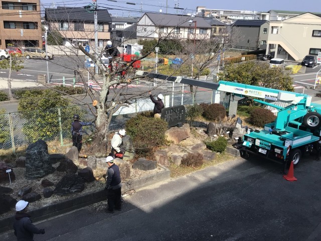 正門付近の桜の木は老木になっており、複数の作業員が対応していました。