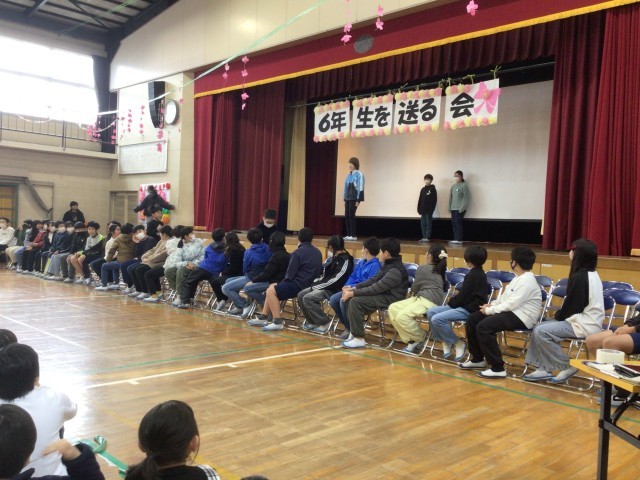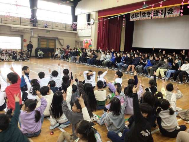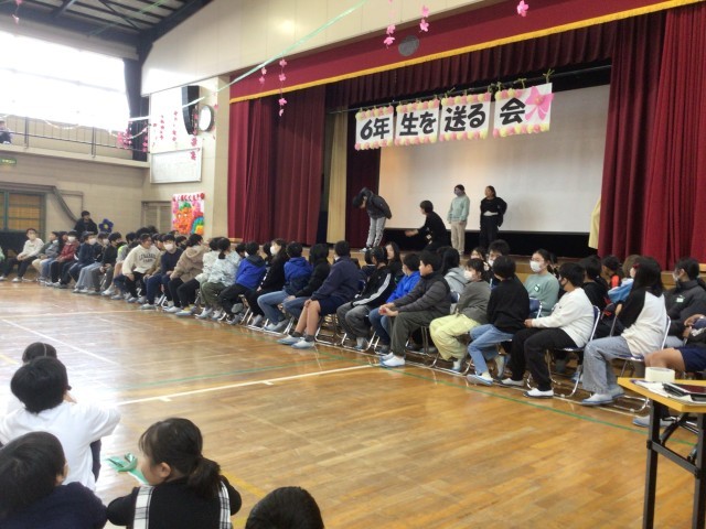 3時間目と4時間目に、体育館で今までお世話になった6年生に、全学年で協力して感謝の気持ちを伝える「6年生を送る会」を開催しました。