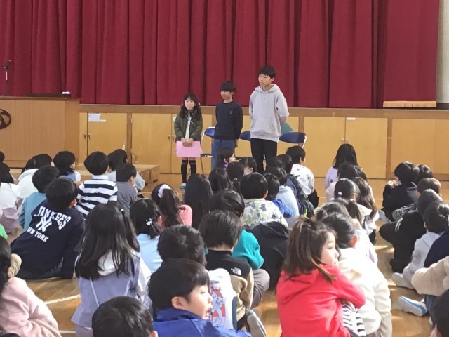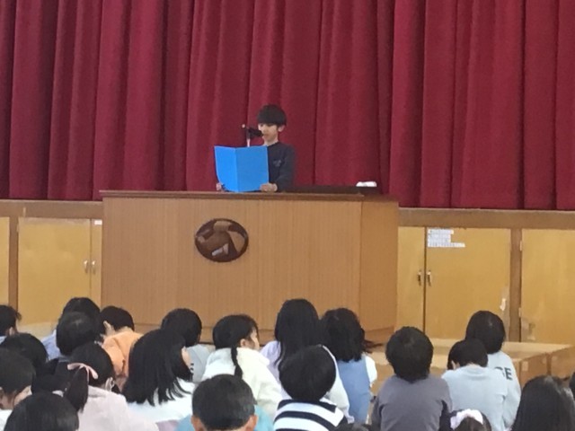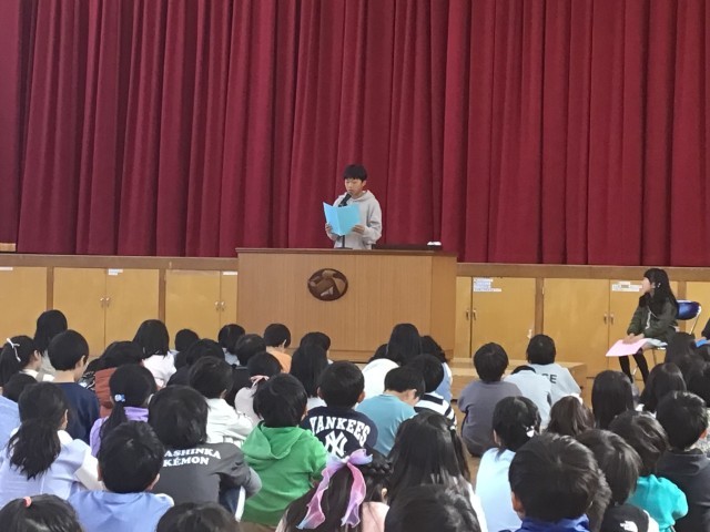 校長の話の後、1年、3年、5年の代表児童が意見発表を行いました。