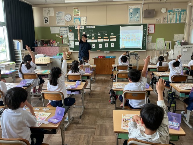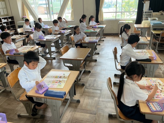 算数科では、「かずとすうじ」の学習で、5までの数の具体物と数図ブロックを対応させながら活動していました。