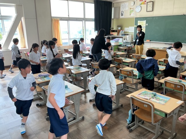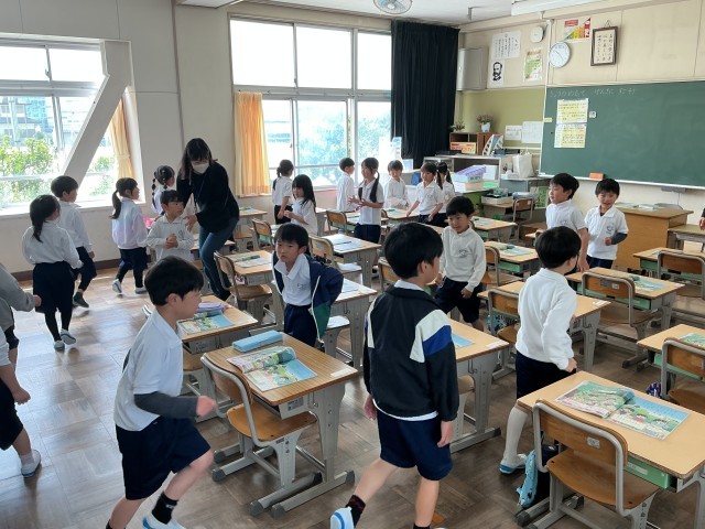 音楽科では、音楽に合わせて教室内を歩くなど、楽しみながら音楽活動をしていました。