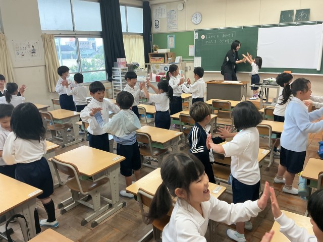 音楽科「うたっておどってなかよくなろう」では、音楽に合わせてペアで楽しく踊っていました。