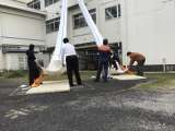 オンラインで消防署の方の話を聞いた後、学年ごとに煙道体験、救助袋体験、消火訓練を...