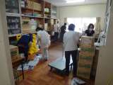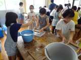 洗った木の枠にコウゾを入れてもらいます。次に、水色、ピンク、黄色パルプを入れても...