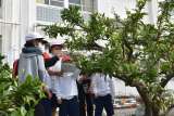 1年生と6年生のペアで、自分たちが世話するみかんの木にプレートを取り付けました。