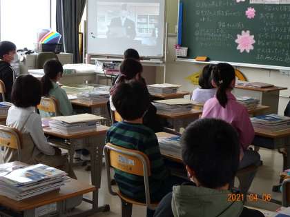 令和3年度の学校生活がスタートしました。新型コロナウィルス感染対策のため、2〜6年生の始業式は教室でリモートで行いました。始業式に先駆けて新任式で新しい先生の紹介。新たな出会いにわくわくしながら話を聞きました。