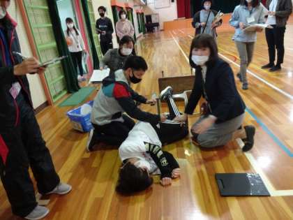 【重大事故シミュレーション研修】4/8(木) 公開日 2021/04/08 更新日 2021/04/08 学校の特色ある活動 先生たちが、万一の重大事故に適切な対応ができるようにシミュレーション研修を行いました。児童に食物アレルギーによるアナフィラキシーショックが起きたという設定で、迅速に対応できるように役割を演じながら、先生たちの動きを確認しました。 大切な子どもたちの命を守ることができるように、先生たちは真剣に研修に取り組みました。