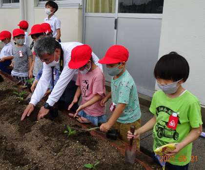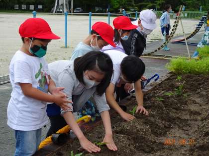 植生ポットに植えたひまわりが10cmくらいに育ち、ボランティアの子どもたちが、英語ルーム前の花壇に植え替えをしました。ボランティア委員の高学年から渡された植生ポットを大事そうに両手で持ち、校長先生が開けた穴にそっと入れ、スコップで丁寧に土をかけていきます。初めてひまわりボランティアに参加する1年生もいて、ボランティア委員が優しく教えていました。ボランティアの子どもたちが植えたひまわりがすくすく育ち、きれいな黄色の花を咲かせるのがとても楽しみです。