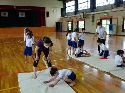 週1時間ずつ1年生と5年2組の体育の授業に体力向上補助指導員の先生に入っていただいています。1年生の授業では、フラフープやマット運動のこつを教えていただき、思い切り体を動かして楽しく活動することができました。指導員の先生に教えていただくことで、安全に体育の授業に取り組み、体力と運動技能の向上につなげることができるようにしたいと思います。