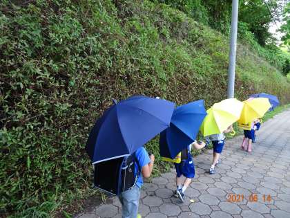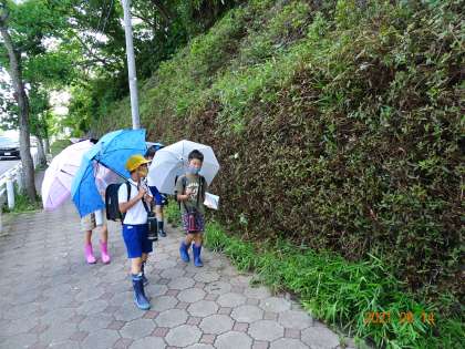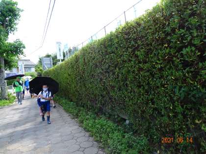 学校メールでもお知らせしましたが、学校東側の歩道沿いの法面に植え込まれている樹木の整備を豊田市道路維持課にしていただきました。法面には、ツツジなどが植えられており、春には花を咲かせています。しかし、ツツジの成長とともに、間に生えたつる性の植物も一緒に伸び、少しずつ通行の妨げになってきていました。今日は、朝から雨が強く降っていましたが、雨が上がると同時に、作業をしてくださり、切り揃えられてさっぱりした姿になりました。
