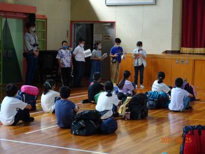 体育館での出発式では、「チャレンジ!チームワーク!最後にみんなでピースサイン」の合言葉を確認し、互いの協力を誓い合いました。保護者の皆様には、寝袋をはじめとして多くの持ち物についての準備へのご協力、ありがとうございました。