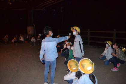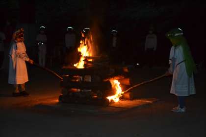 午後7時からはお待ちかねのキャンプファイヤーが始まりました。最初は六所の火の神の入場から点火、その後「猛獣狩り」や「木こりとリス」などの楽しいゲームが行われました。そして、その次に行われたトーチワークは幻想的で素晴らしかったです。最後にクラスの誓いをファイヤーに向けて述べました。実行委員が中心となって進められたこのキャンプファイヤーは子どもたちにとって一生の宝物となったことでしょう。