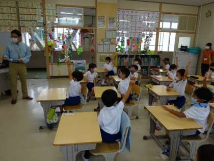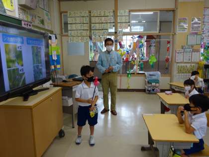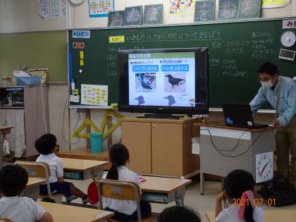 生活科の学習で「生き物探し」の出前授業が行われました。自然観察の森から講師の先生に来ていただき、バッタの見分け方や、セミの鳴き声の違いなどさまざまなことを教えていただきました。クイズ形式の説明で子どもたちはとても楽しそうに話を聞いていました。