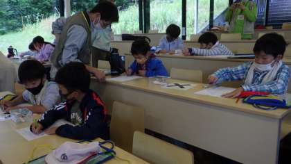 雨天のため、室内でチョウトンボの標本を使って「昆虫の体のつくり」を観察しました。よく見てスケッチをする中で、触角や口の形の違いから食べ物や生活の違いを見付けました。