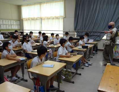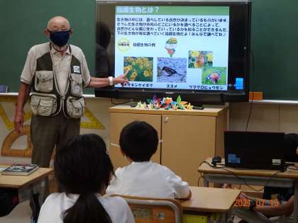 4年理科「季節と生物」の学習の一環で、豊田市役所環境政策課から講師の先生に来ていただき、出前授業を行いました。身近な生き物について、鳴き声や見分け方、在来種と外来種の違いなどについて教えていただきました。生き物が大好きな子どもたちは、真剣に講師の先生のお話を聴き、地域の自然についての関心を深めていました。