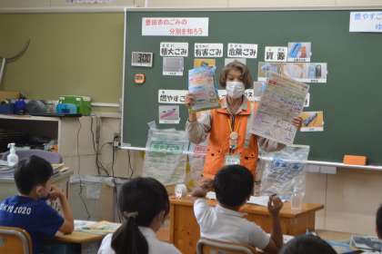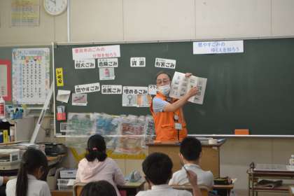 4年生が社会科「ごみの処理と利用」の学習の一環で、環境学習施設エコットから講師の方にお越しいただき、出前授業をしていただきました。子どもたちは、家庭から出るごみについてどんな分別をすればよいかをワークシートを使って考えたり、燃やすごみの行方について教えていただいたりして、初めて知ったことがたくさんありました。教えていただいたことを今後の生活に生かし、環境への意識が高まることを期待しています。