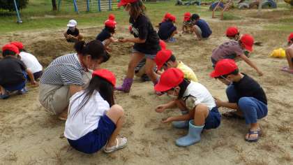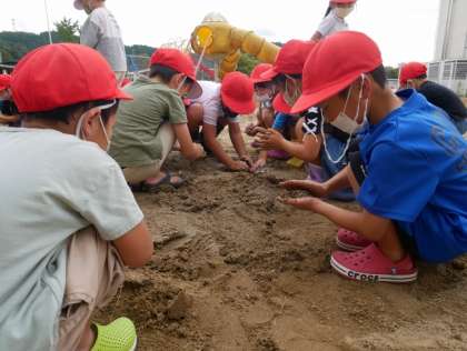 泥や砂を丸めたり、こすったりする活動を通して手や指の感覚を養うとともに、自然に親しむ豊かな心を育んでいきたいと思います。
