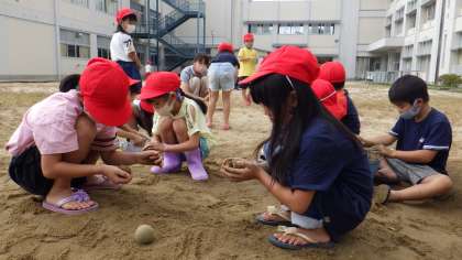 1年生が生活科の授業で「どろだんごづくり」をしました。泥を丸めて砂をまぶし、手で丁寧にこする作業を繰り返していくうちに、つるつるぴかぴかの泥だんごができました。