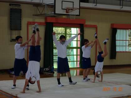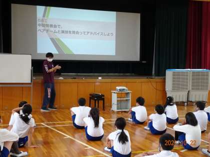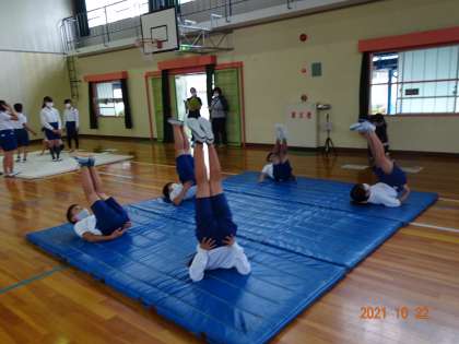 5年生は、体育でマット運動「シンクロマット」に取り組んでいます。今日は、5年1組で研究授業。校長先生はじめたくさんの先生方の見守る中、子どもたちは生き生きと活動に取り組んでいました。「シンクロマット」の目標は、グループで技を高め合いながら息の合った演技をすることです。BTSの「ダイナマイト」の曲に合わせながら、子どもたちは一生懸命マット運動に取り組んだり、ペアグループのアドバイスからさらに良い動きができるように話し合ったりしていました。