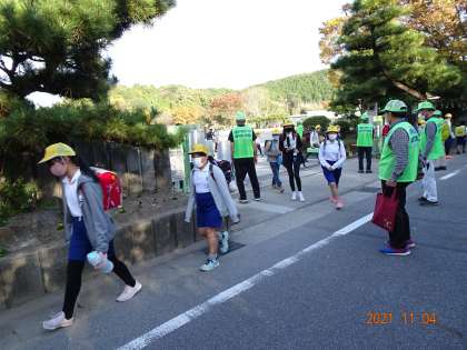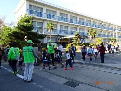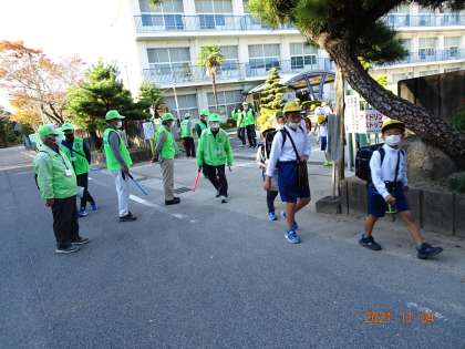 11月のグリーンレンジャー定例会を行いました。新型コロナウィルスの感染状況が落ち着いてきましたので、やっと皆様にお集まりいただくことができるようになりました。通学路の工事や注意箇所について連絡したり、子どもたちの登下校の様子についてお聞きしたりしました。終了後には、一斉下校の子どもたちと一緒に歩いていただきました。毎日、Gレンの皆様が子どもたちを見守っていただいているおかげで、安全に仲良く登下校することができています。皆様のご協力に心より感謝申し上げます。