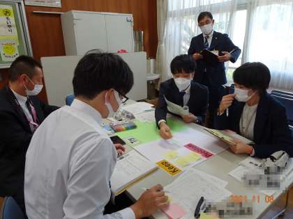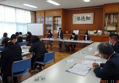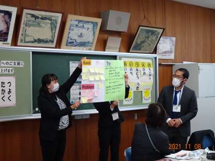 学校訪問では、よりよい授業づくりを目指して、指導員の先生や教育委員会の先生方にご指導をしていただきました。先生たちは、授業改善に向けてグループごとに真剣に話し合いました。