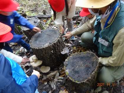 【トヨタの森 1の2】11/10 公開日 2021/11/11 更新日 2021/11/11 学校の特色ある活動 1年2組が生活科の学習の一環でトヨタの森に校外学習に行きました。きれいな木の葉やドングリ、キノコを見つけたり、キンカンの葉っぱをほんのちょっとかじってみたりして、紅葉で色付いたトヨタの森の秋を、五感を使ってたくさん体験しました。