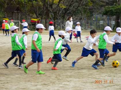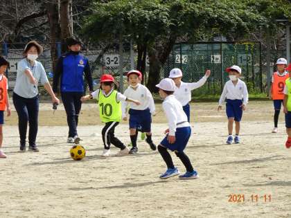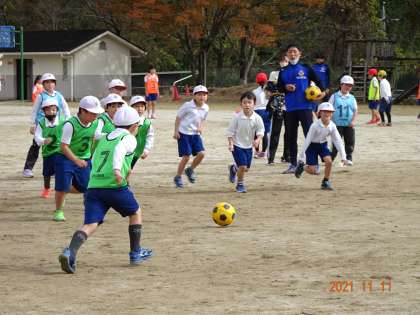 2年生も、グランパスボール教室でサッカーの基本的なボールさばきや動き方を教えていただきました。練習の後の試合では、どの子もみんな、夢中になってボールを追い、サッカーの楽しさを感じることができました。