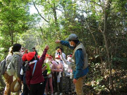2年生が生活科の学習の一環で自然観察の森に行きました。クラスごとにバスに乗り出発!真っ青な秋晴れの空の下、レンジャーさんの後に続き、森の植物をたくさん教えていただきました。