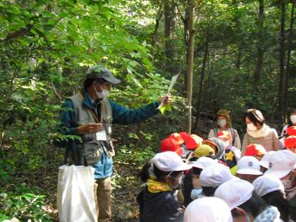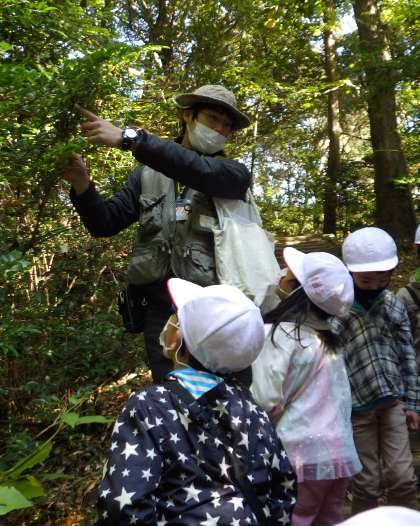 クヌギのどんぐりのかわいい帽子や、ふわふわした木の葉、紫色の木の実などに子どもたちは目を輝かせ、わくわくしながら森を探検しました。