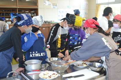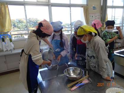 6年2組で調理実習をしました。新型コロナ感染対策のため、本来なら5年生から実施する調理実習がこれまで1回も行うことができず、やっと初めての調理実習を行うことができました。校長先生が育ててくださった紫芋を使い、サツマイモもちとバター醤油炒めを作りました。包丁を持った経験の少ない子もいて、おっかなびっくりの手つきに見ている方がひやひやする場面もありましたが、グループで協力し、おいしく作ることができました。「初めての調理実習、すごく楽しかった。」、「家でもぜひ作ってみたい。」と、多くの子が口にしていて、調理実習への子どもたちの思いの強さが伝わってきました。