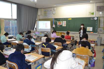 【授業参観1日目 5年】11/22 公開日 2021/11/22 更新日 2021/11/22 学校行事 5年1組は、理科「物のとけ方」、2組は社会「これからの食糧生産と私たち」。実験や資料をもとに、課題について真剣に考えました。