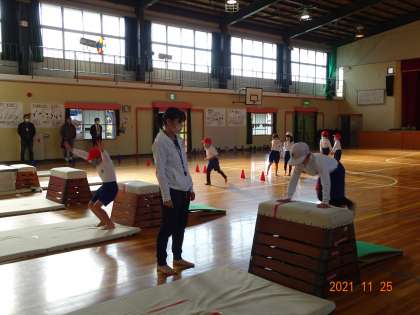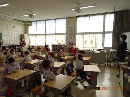 【授業参観 3日目1年】11/25 公開日 2021/11/26 更新日 2021/11/26 学校行事 授業参観3日目。1年1組は外国語活動「色の言い方」。1年2組は体育「跳び箱運動」。みんな元気いっぱい頑張っています。