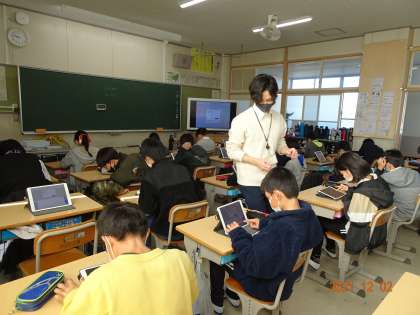 【ICT支援員さんによる情報教育 6年】12/2 公開日 2021/12/02 更新日 2021/12/02 各学年から ICT支援員の先生にお越しいただき、タブレットを用いた情報の授業を行いました。6年生は「forms」を使ったアンケート作り。クラスの友達に好きな音楽や好きな食べ物などを入力してもらうと、傾向をつかむことができます。思い思いの問いを考え、アンケートを作ることを通して、コンピュータの活用方法を学ぶことができました。