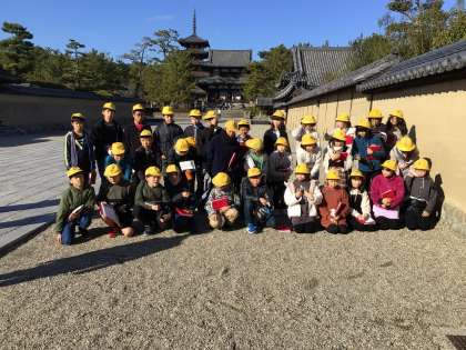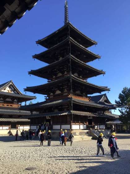 修学旅行2日目その4 公開日 2021/12/09 更新日 2021/12/09 学校行事 修学旅行最後の見学地、法隆寺を訪れました。日本三大門の一つ南大門から入り、五重塔、大講堂、金堂などを見学しました。とても空いていて、伽藍内部でもクラス写真を撮ることができました。大宝蔵殿には、飛鳥時代の仏像などの文化財が多くあり、歴史を感じました。予定より10分ほど遅れて帰路につきました。