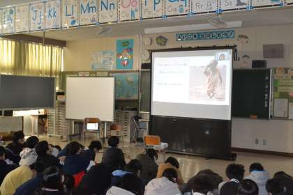 WFP(国連世界食糧計画)で活躍されている方とオンラインでつなぎ、キャリア教育の授業を行いました。講師は、アフリカなどの70か国以上訪れ、多くの経験をしてきた方です。小学3年生のときに飢餓に苦しむ女の子をテレビで見て、「世界は不平等だ」と感じ、貧困に苦しむ人たちを救いたいと思ったそうです。「自分自身の様々な経験の一つ一つが今の私を作っている。一つ自分の軸を作ること。何があっても環境や誰かのせいにしない生き方をしてほしい。」と子どもたちに伝えてくださいました。
