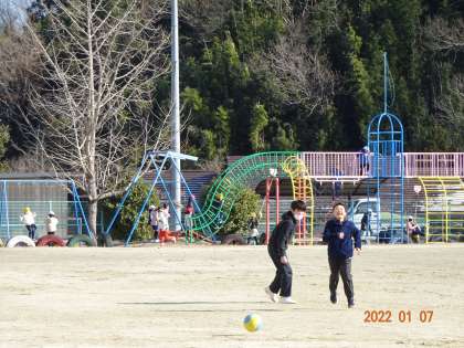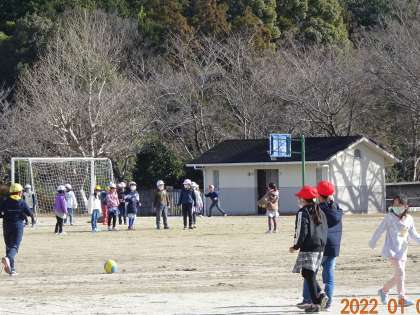 令和4年最初の1日。日差しは明るいものの、冷たい風が吹き、気温はかなり低くなっています。でも、子どもたちは元気そのもの。書き初め大会を終えるとたくさんの子どもたちが出てきて、友達と仲良く鬼ごっこをしたり、遊具やボールで遊んだりして笑顔いっぱいの姿が運動場に広がっていました。